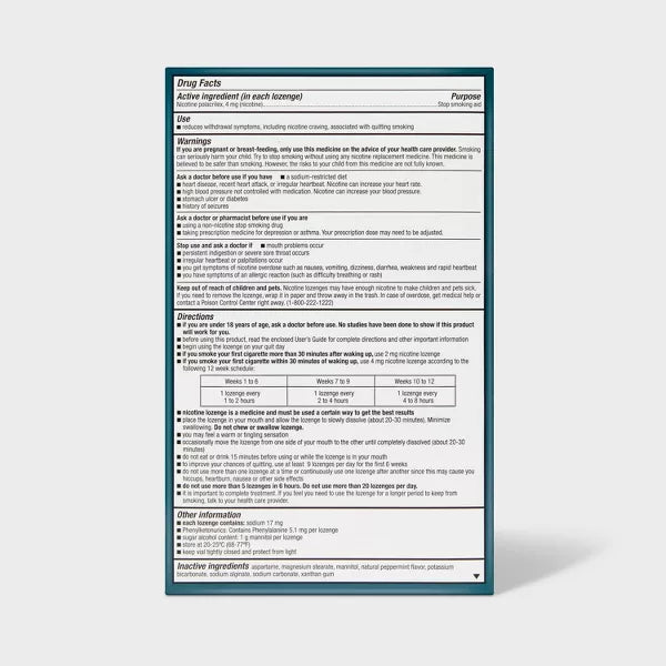 Get serious about your quit plan with the 4mg Nicotine Lozenge Stop Smoking Aid from up&up™. This mint nicotine lozenge is part of a nicotine replacement therapy (NRT) program designed to help regulate, control and gradually reduce your body's cravings for nicotine. Participating in an NRT is targeted at easing the irritability and restlessness associated with cravings during your transition to becoming a nonsmoker. Because replacement therapy only targets physical dependence on nicotine, this package also includes information on quitting smoking that helps deal with the psychological aspects of smoking cessation. Finding the right balance of NRT and support is key to easing your way into this new lifestyle. When you're ready to make a change, having the right resources can make all the difference.